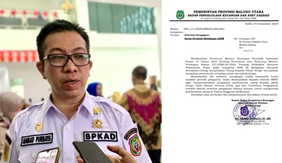 Ternate, JhaziraMU– Pemerintah Provinsi Maluku Utara melalui Badan Pengelolaan Keuangan dan Aset Daerah (BPKAD) menginstruksikan seluruh Organisasi Perangkat Daerah (OPD) untuk memprioritaskan pengajuan Surat Perintah Membayar (SPM) terkait utang kepada pihak ketiga.
