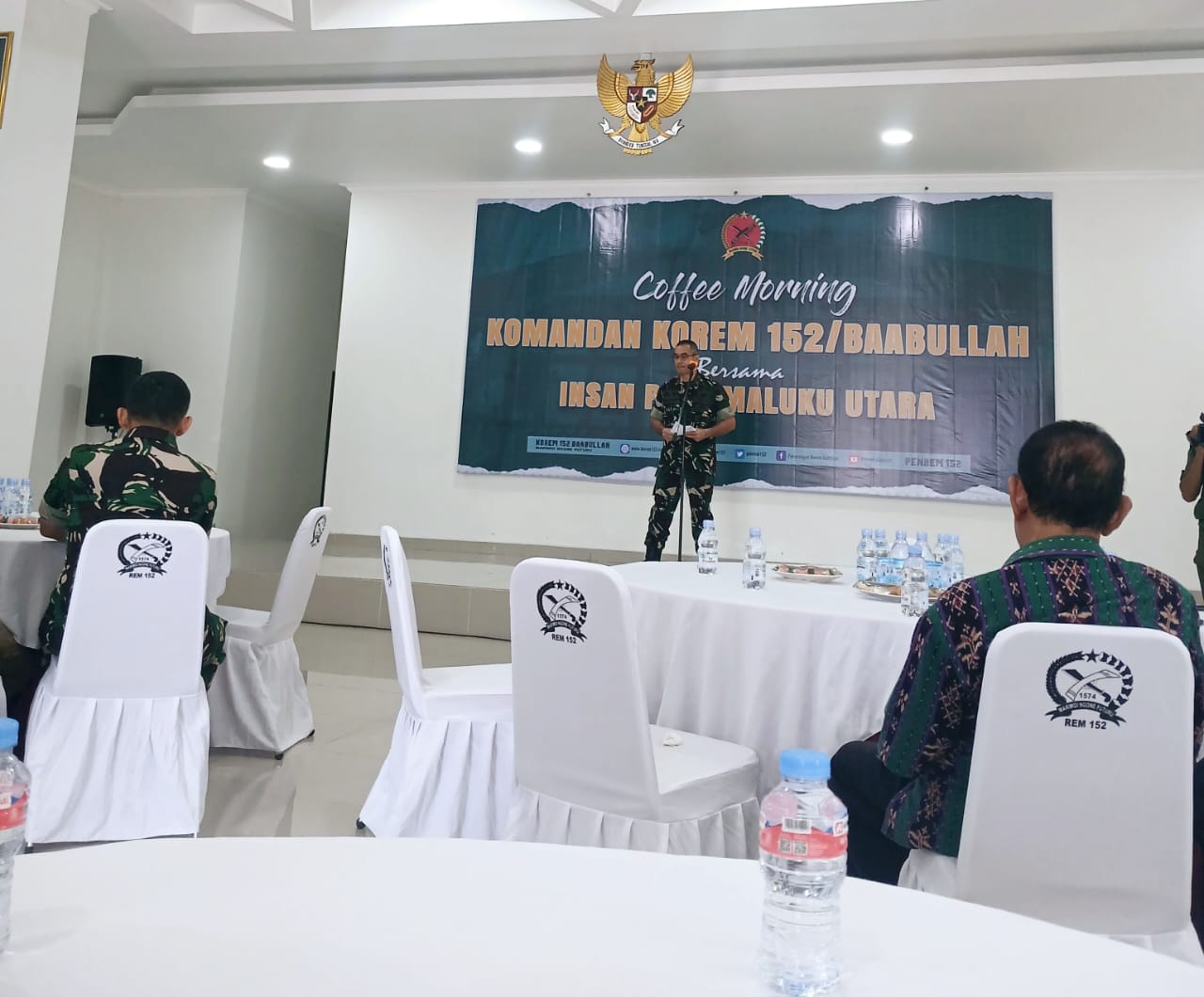 TERNATE, JhaziraMU- Suasana hangat mewarnai Coffee Morning yang digelar Korem 152/Babullah bersama insan pers Maluku Utara di Aula Singa, Rabu (12/2/2025). Dalam forum ini, Danrem 152/Babullah, Kolonel Inf. Enoh Solehudin, menegaskan pentingnya sinergi antara TNI dan media dalam menjaga stabilitas daerah.