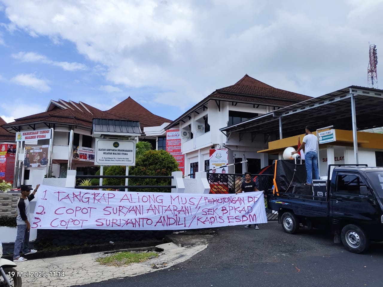 Aksi unjuk rasa digelar KPK Malut di depan Kantor Kejati Malut pada Senin (19/5/2025). Dalam orasinya, Koordinator Lapangan Alimun Nasrun mengungkap dugaan penyalahgunaan jabatan yang mengakibatkan pemborosan anggaran, terutama dalam belanja makan minum.