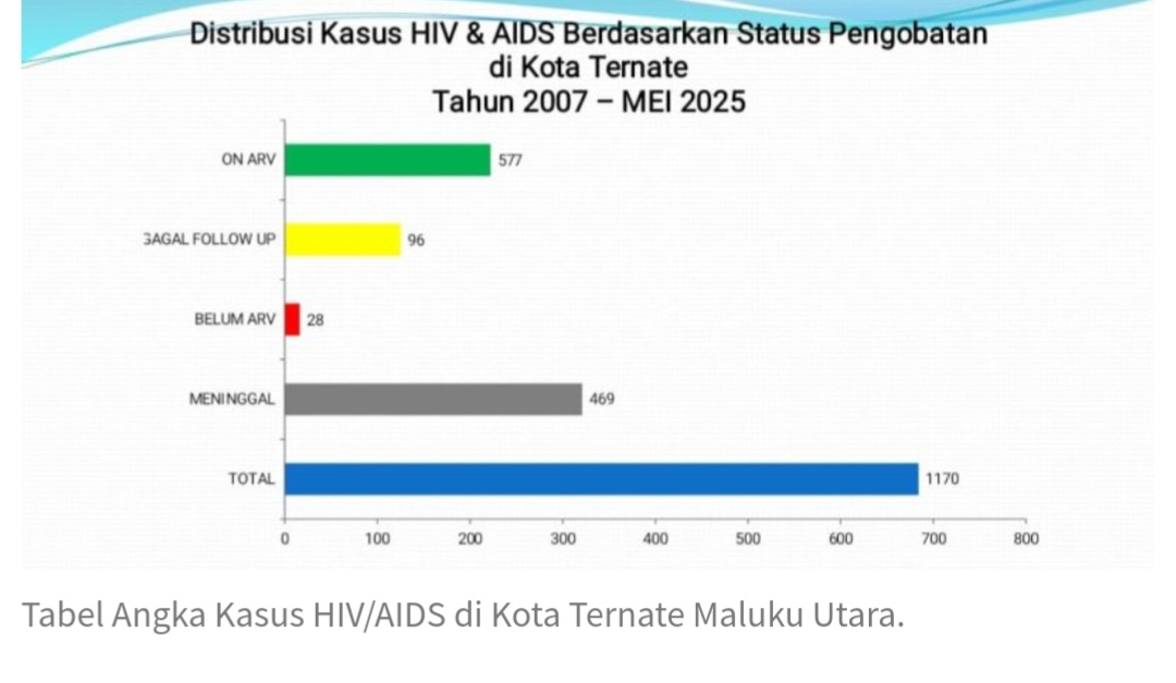 TERNATE, Jhaziramu — Dinas Kesehatan (Dinkes) Kota Ternate mencatat jumlah kasus HIV/AIDS terus mengalami peningkatan signifikan sejak 2007 hingga Mei 2025.