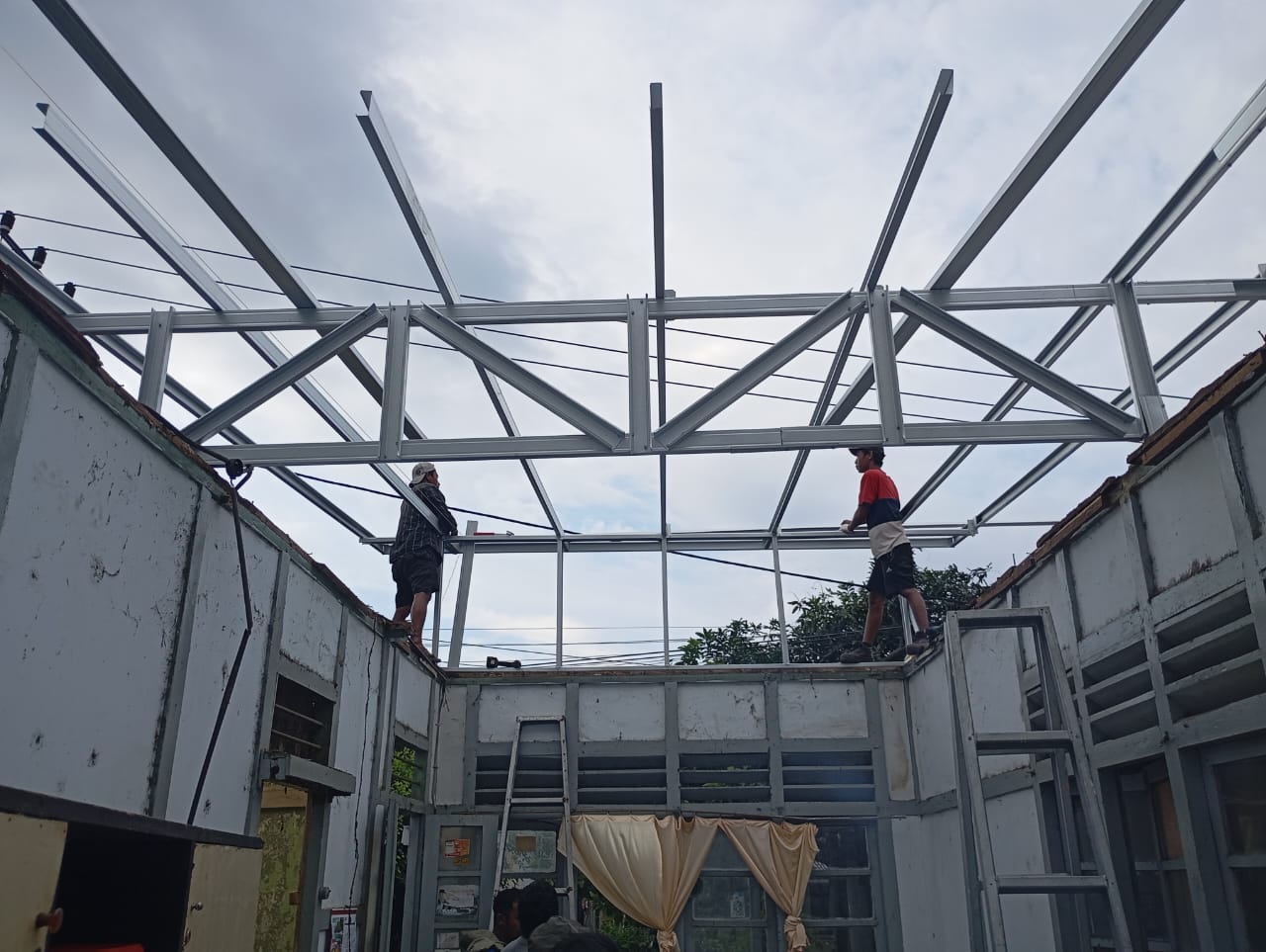 Dari pantauan di lokasi pada Selasa (29/7/2025), sejumlah tukang terlihat aktif memasang rangka atap baru berbahan baja ringan menggantikan bagian-bagian lama yang lapuk dan bocor.
