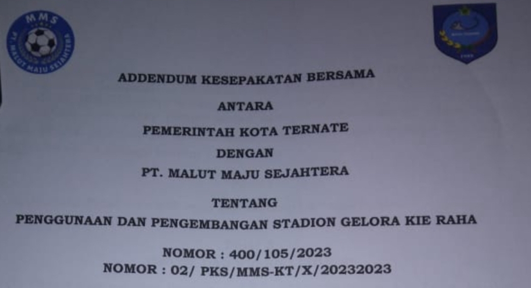 Seperti diketahui, MoU antara Pemkot Ternate dan PT MMS ditandatangani Wali Kota M. Tauhid Soleman dengan nomor 02/PKS/MMS-KT/X/2023. Tauhid kemudian mengeluarkan surat keterangan bernomor 500.17.3.3/17/2025 yang menyatakan Stadion GKR seluas 23.142 m² merupakan aset Pemkot Ternate.