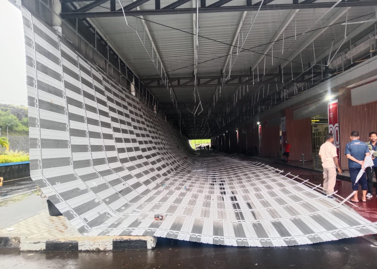Yasmin, salah seorang saksi mata, menyebut ambruknya plafon diduga dipicu angin kencang yang menghantam kawasan bandara. “Syukurlah saat itu tidak ada penumpang karena sedang tidak ada penerbangan,” katanya.