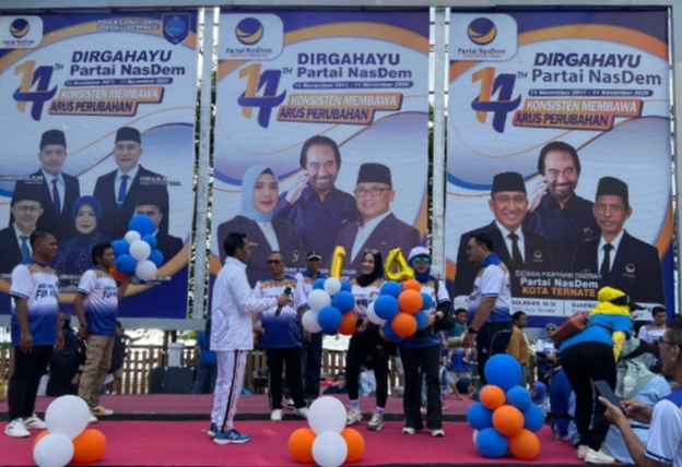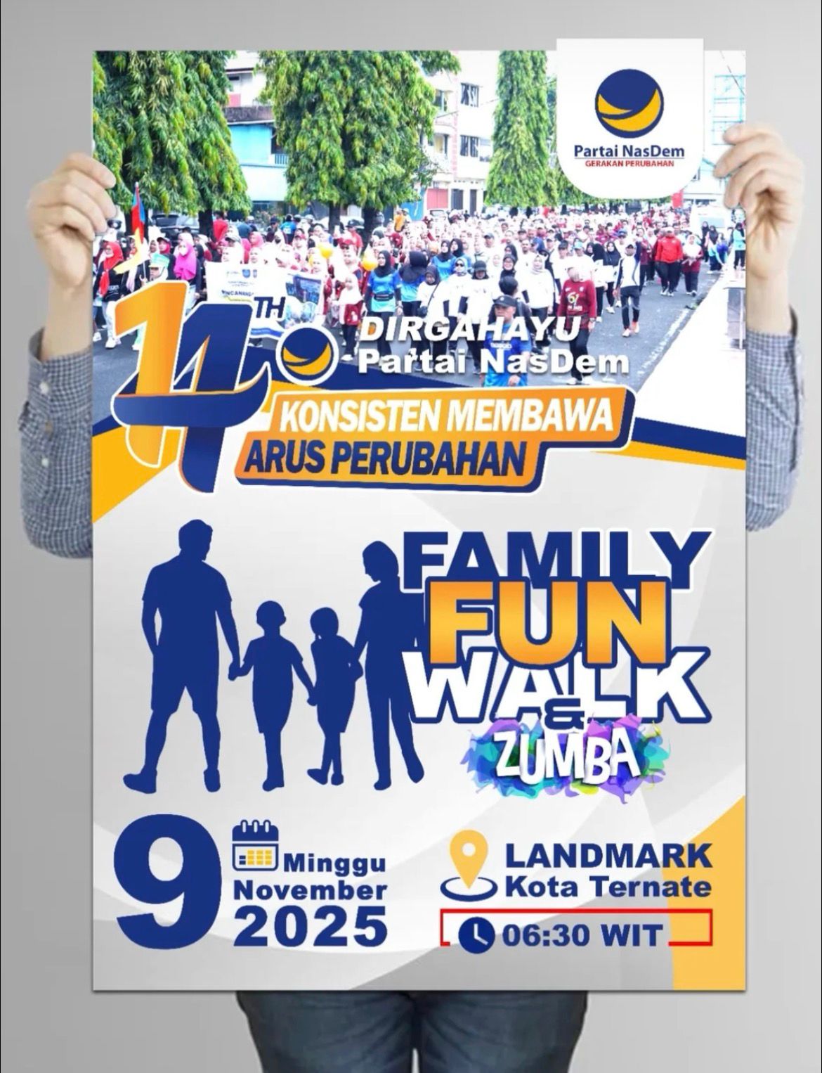 TERNATE, Jhazirah.com- Udara pagi Taman Nukila, Minggu (9/11/2025), dipastikan akan dipenuhi semangat biru Partai NasDem. Dalam suasana penuh keceriaan, DPD Partai NasDem Kota Ternate berkolaborasi dengan DPW Partai NasDem Provinsi Maluku Utara menggelar kegiatan Fun Walk dan Zumba untuk memeriahkan HUT ke-14 Partai NasDem.