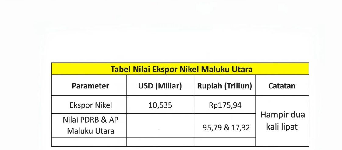 Besarnya nilai ekspor tersebut bahkan melampaui total PDRB 2024 Malut yang sebesar Rp95,79 triliun, serta seluruh APBD kabupaten/kota dan provinsi yang hanya mencapai Rp17,32 triliun.